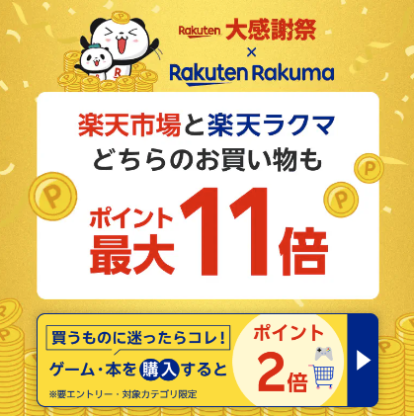 ~ 26(金) 1:59事前エントリー受付中獲得ポイント 楽天市場&ラクマの買い物ポイント最大11倍(最大1,500ポイント) エントリー 開催期間中ならいつでも 基本ルール キャンペーンにエントリーし、対象期間内にラクマで合計1,000円以上を購入すると、楽天市場とラクマでの買い物ポイントが最大11倍までアップ キャンペーン