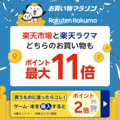 ~ 29(木) 1:59事前エントリー受付中獲得ポイント 楽天市場&ラクマの買い物ポイント最大11倍(最大1,500ポイント) エントリー 開催期間中ならいつでも 基本ルール キャンペーンにエントリーし、対象期間内にラクマで合計1,000円以上を購入すると、楽天市場とラクマでの買い物ポイントが最大11倍までアップ キャンペーン